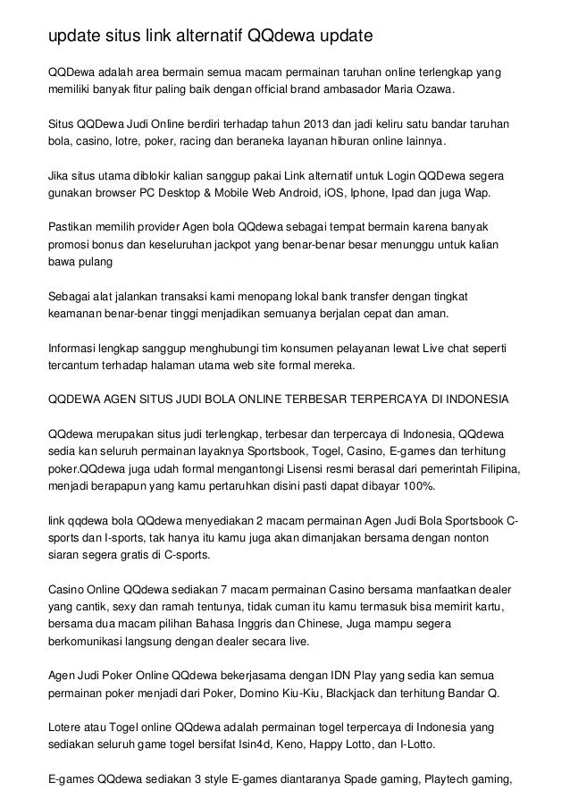 Selain memberikan kemudahan di saat mengakses dan berselancar masuk ke dalam perusahaan situs bandar judi online qqdewa. Situs qqdewa ini dikenal sebagai salah satu situs judi online terbaik pada tahun 2015 hingga tahun sekarang ini, disini anda tidak perlu ragu untuk tidak dibayar hasil kemenangan anda, karena disini kami pasti akan membayar total kemenangan anda. Taruhan bola online, live casino, slot game. Qqdewa situs taruhan judi online yang menyediakan berbagai jenis permainan menarik yakni: Qqdewa situs qqdewa info link alternatif qqdewa.
